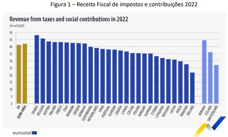 Antes de mais, e como no discurso dos "liberais" se associa sempre à competitividade a carga fiscal, há que desmistificar um pouco uma ideia que tem sido recorrentemente difundida, e utilizada como pressuposto para a retórica liberal, de que Portugal tem uma carga fiscal muito elevada. Tal como pode ser observado através da Figura 1, a receita fiscal do Estado em relação ao PIB tem, em 2022, em Portugal, um valor inferior à média da União Europeia e ainda mais baixo quando comparado com a média da Zona Euro. Adicionalmente, há ainda que notar que, contrariamente à retórica "liberal", não existe uma relação inversa entre a carga fiscal e o Índice de Desenvolvimento Humano (IDH). A título de exemplo, a Holanda apresenta uma carga fiscal e um IDH muito superiores a Portugal.